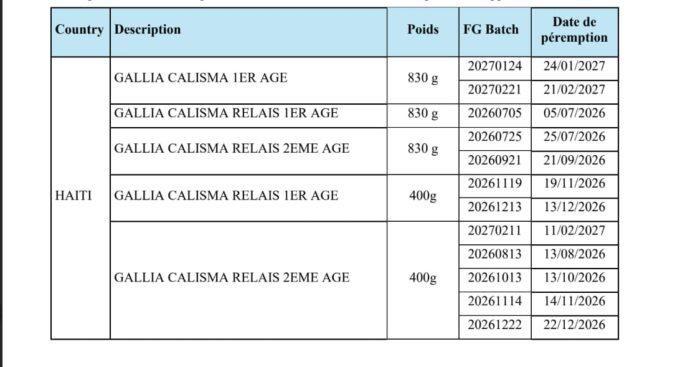 Dans une lettre de Danone communiquée à NUTRIPHAR, importateur des produits Blédina et Gallia pour plusieurs supermarchés haïtiens, l’entreprise française a annexé la liste des produits concernés par le retrait en Haïti. Pour plus de clarté, AyiboPost publie la fiche descriptive des lots de laits visés par cette mesure.