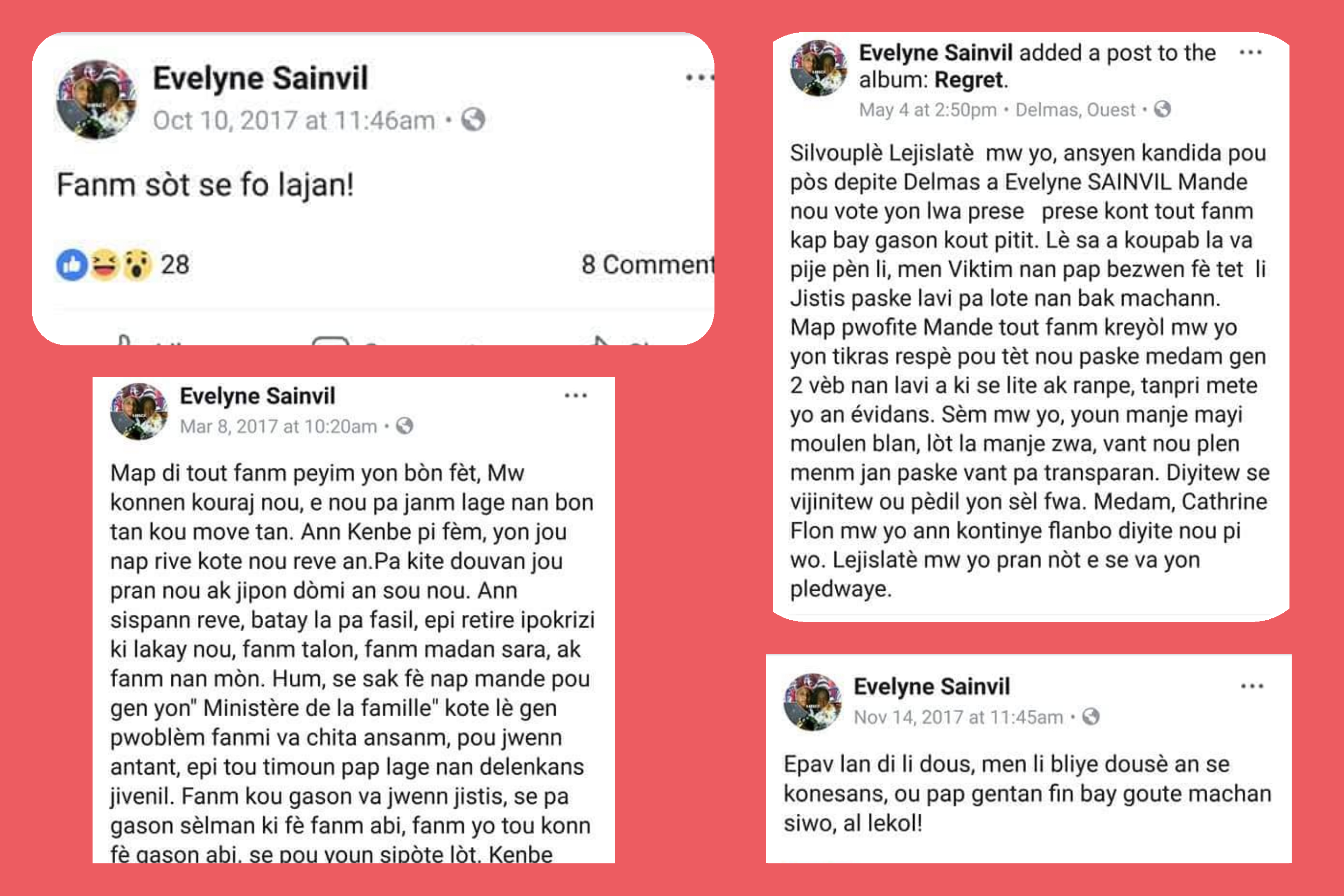 Ayibopost publie in extenso la lettre de contestation de la nomination de Madame Evelyne Sainvil à la tête du ministère de la Condition Féminine et aux droits des femmes. Cette lettre est signée par plus d’une soixantaine de personnalités publiques et d’organisations de défense des droits des femmes . Madame Sainvil avant d’être nommée à la tête du MCFDF a ouvertement eu des propos anti-féministes et parfois anti-femmes comme le démontre les captures d’écran de sa page facebook personnelle.