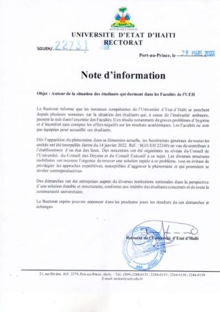 Le 28 mars 2022, le rectorat de l’Université d’État d’Haïti à travers une note déclare se «pencher sur la situation des étudiants qui passent leur nuit dans l’enceinte des facultés ». Jusque-là, aucune suite n’a été constatée. Des entités comme la Faculté des Sciences humaines et la Faculté des Sciences économiques, au sein de l’UEH, ont tenté d’expulser ces étudiants. La faculté de droit (FDSE) a délogé de ses locaux ceux qui s’y trouvaient, au cours du mois de mars.