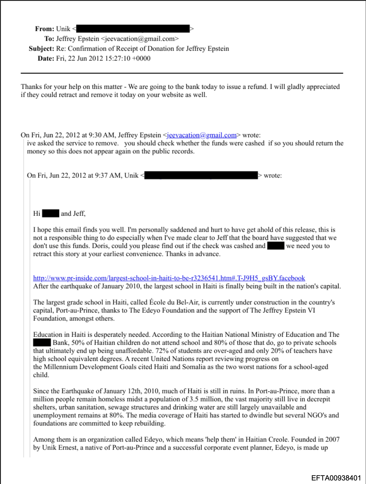 Un premier groupe de courriels datés entre 2011 et 2012 retrace une « contribution importante » accordée par la Fondation Jeffrey Epstein VI à Unik Ernest, via sa structure EDEYO, présente en Haïti, pour la reconstruction d’une école destinée à des enfants de Bel-Air, détruite par le tremblement de terre de 2010.