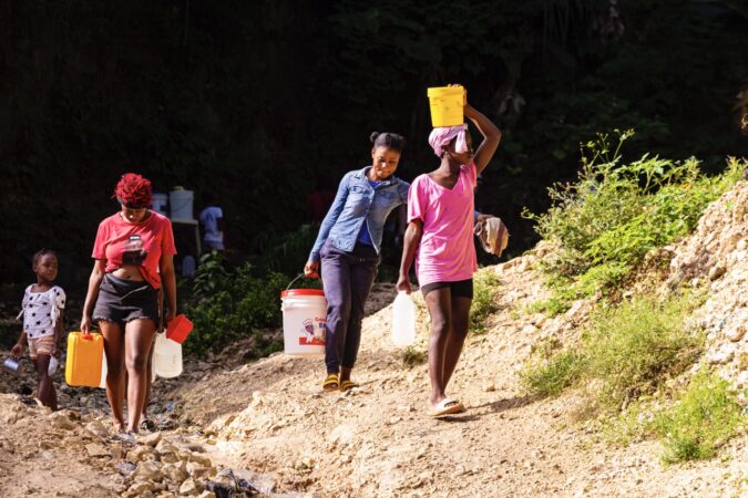 Des habitants reviennent du réservoir avec leurs récipients pleins. Photos: Jean Feguens Regala pour AyiboPost. Octobre 2025