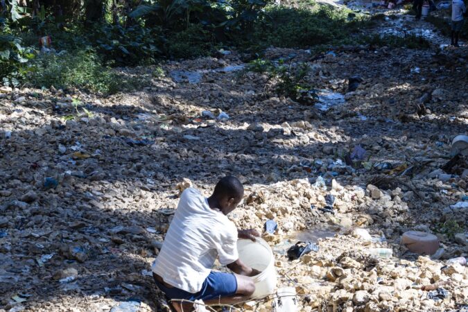 Un homme lave son récipient dans le lit de la rivière avant de le remplir. Photos: Jean Feguens Regala pour AyiboPost. Octobre 2025
