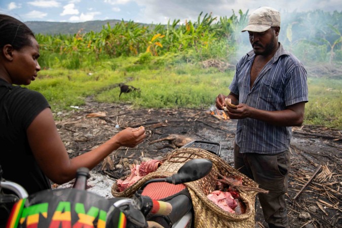 Deux personnes qui achètent de la viande de porc au marché Tunel à Pétion-Ville le 5 février 2022.