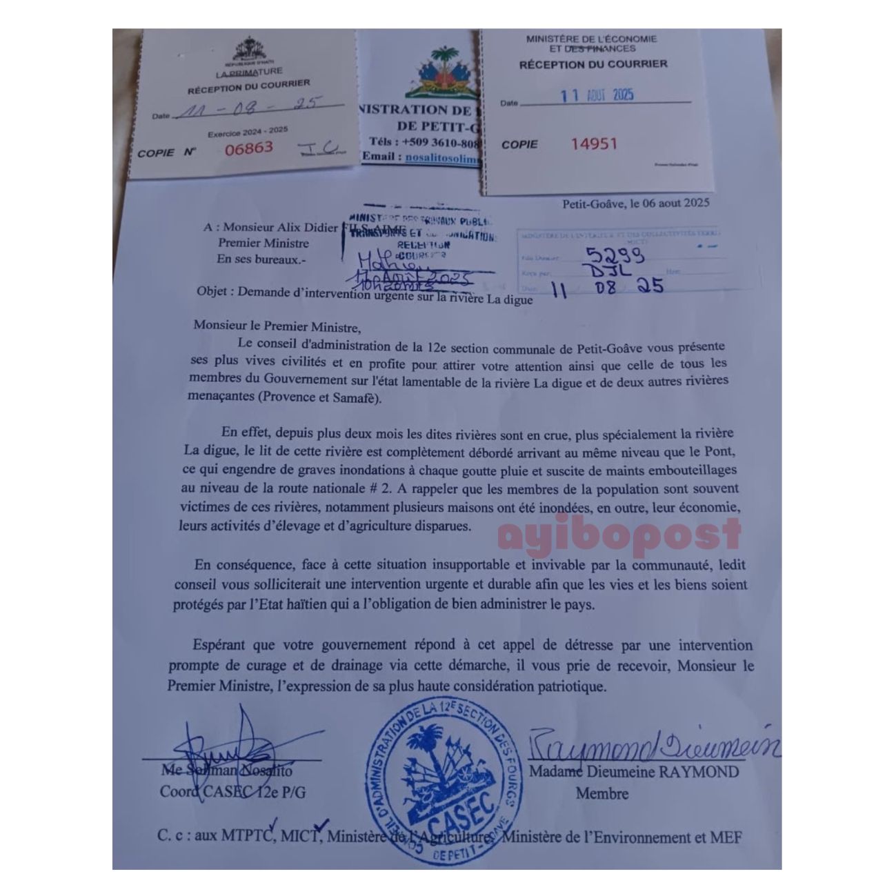 La première lettre adressée au gouvernement par le Conseil d’Administration de la douzième Section Communale de Petit-Goâve, datée d’août 2025 et partagée avec AyiboPost, demandait des « interventions urgentes » sur trois cours d’eau, dont la rivière La Digue.