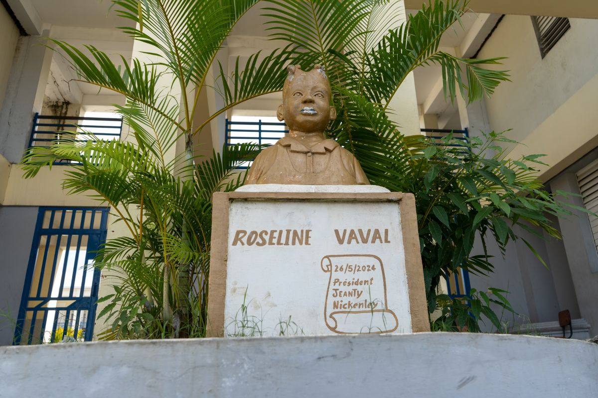 Couverture |Un buste de Roseline Vaval à l’intérieur du Lycée Roseline Vaval en 2024. 19 mars 2026. Photo : Amy Jean Louis