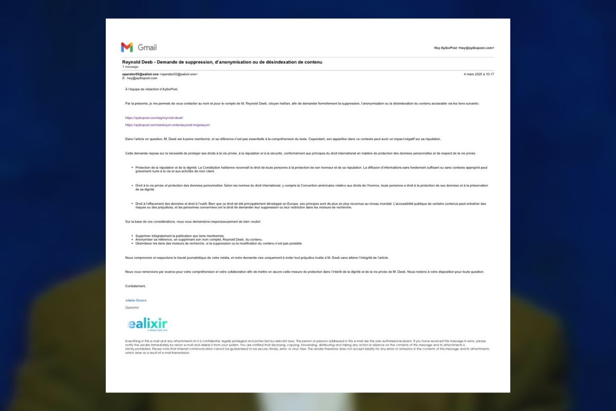 La compagnie Ealixir One a ordonné à AyiboPost, en décembre, de supprimer le nom de l’homme d’affaires Reynold Deeb d’un article publié en 2022 sur les motivations du régime de sanctions des États-Unis.