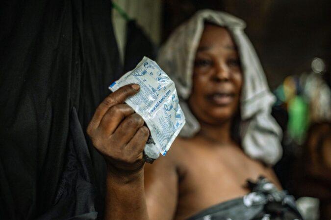0 Une femme tient un sachet de sérum oral, utilisé pour prévenir la déshydratation. Photo : Jean Feguens Regala pour AyiboPost