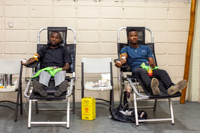 Deux donneurs de sang lors d’une collecte à la Faculté de médecine de l’Université Notre Dame d’Haïti, à Pacot, le 11 août 2023. | © David Lorens Mentor/AyiboPost