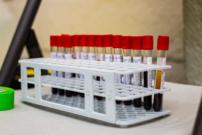 Des échantillons de sang collectés le 11 août 2023 à la Faculté de médecine de l’Université Notre Dame d’Haïti, à Pacot. | © David Lorens Mentor/AyiboPost