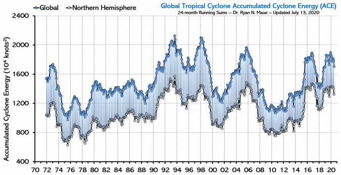 Ce graphique montre l’augmentation interannuelle mondiale de l’Énergie cyclonique accumulée (ACE) depuis le début des années 70 jusqu’à aujourd’hui. La ligne bleue concerne le monde en générale et la ligne grise est pour l’hémisphère nord